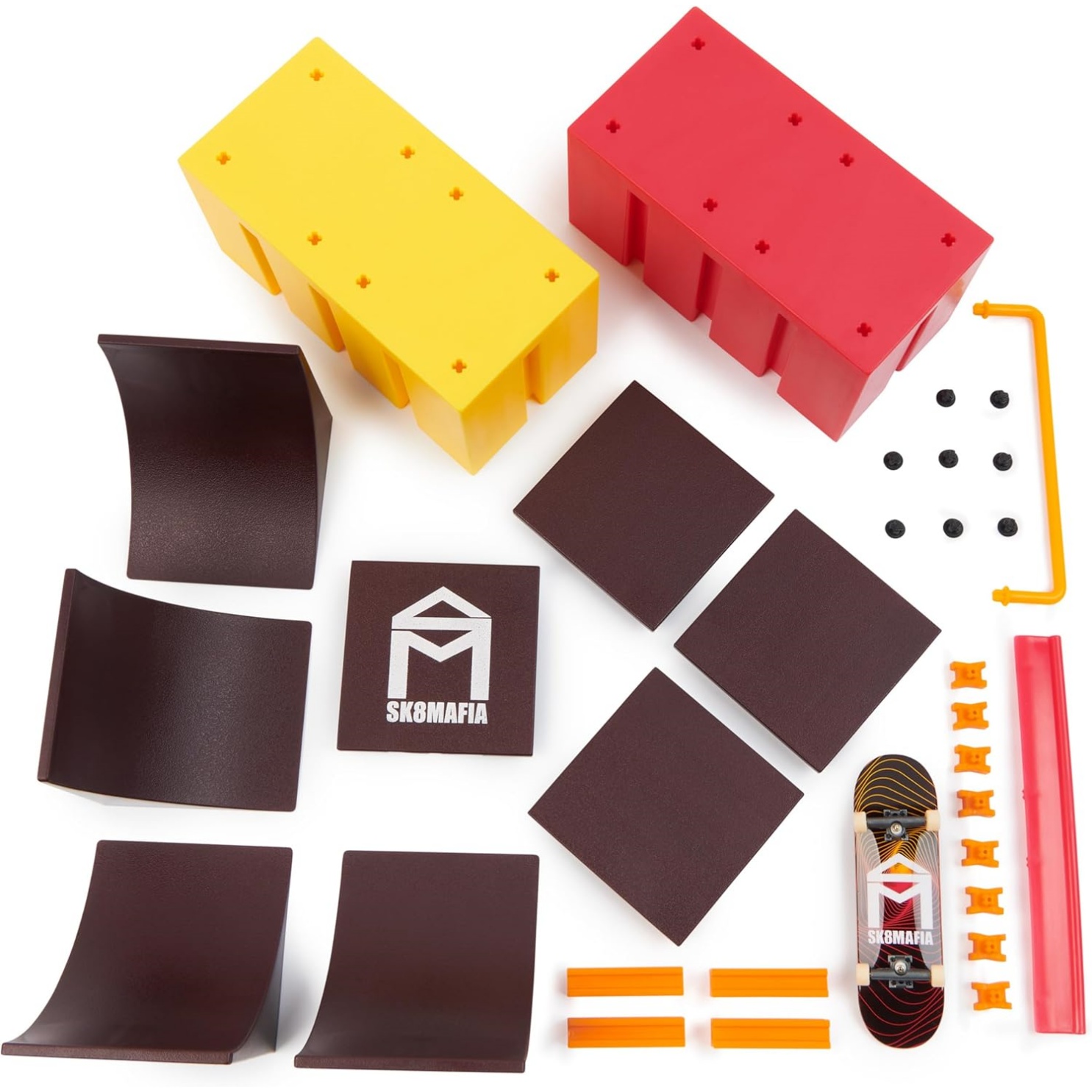 Includes: 1 Tech Deck Fingerboard, 4 Roll-In Ramps, 2 Boxes, 1 Rail, 1 Coping, 3 Panels, 1 Sk8Mafia Panel, 8 X-Connectors, 4 Large X-Connectors, 8 Foot Pegs, Instruction Sheet